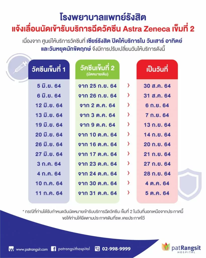 ทั้งนี้ กรณีที่ท่านได้รับกำหนดวันนัดหมายเข้ารับบริการฉีดวัคซีน Astra Zeneca เข็มที่ 2 ในวันที่นอกเหนือจากประกาศนี้ ขอให้ท่านให้ยึดตามประกาศเดิมที่รพ.เคยประกาศไว้ คลิก >> https://bit.ly/3mo4MsY