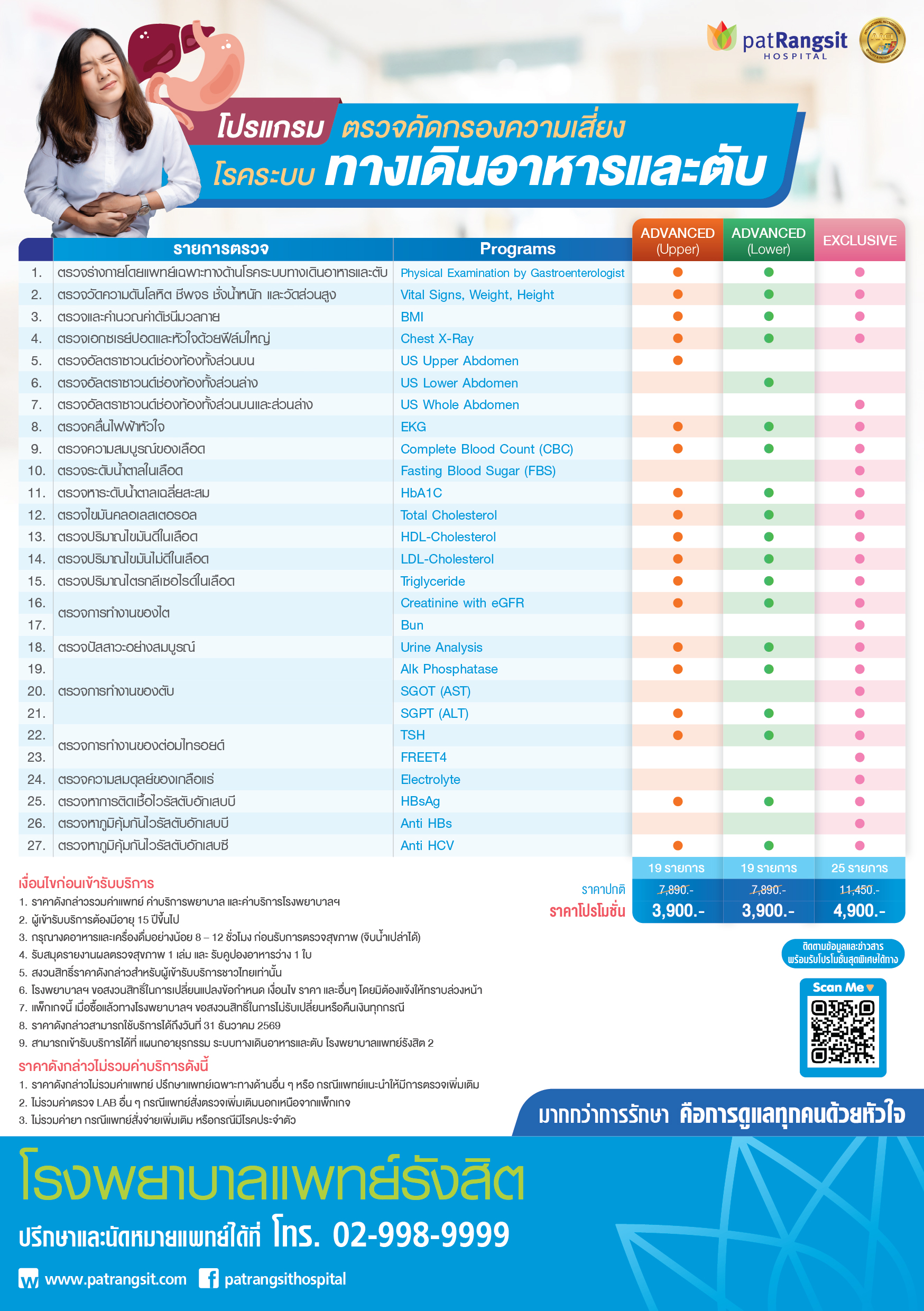 | 1 | ตรวจร่างกายโดยแพทย์เฉพาะทางด้านโรคระบบทางเดินอาหารและตับ | Physical Examination by Gatroenterologist | ✔ | ✔ | ✔ |